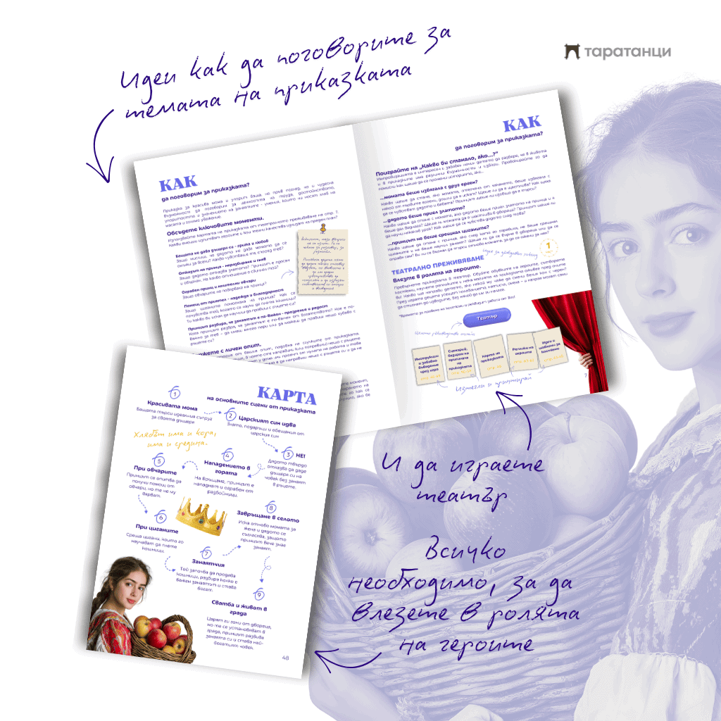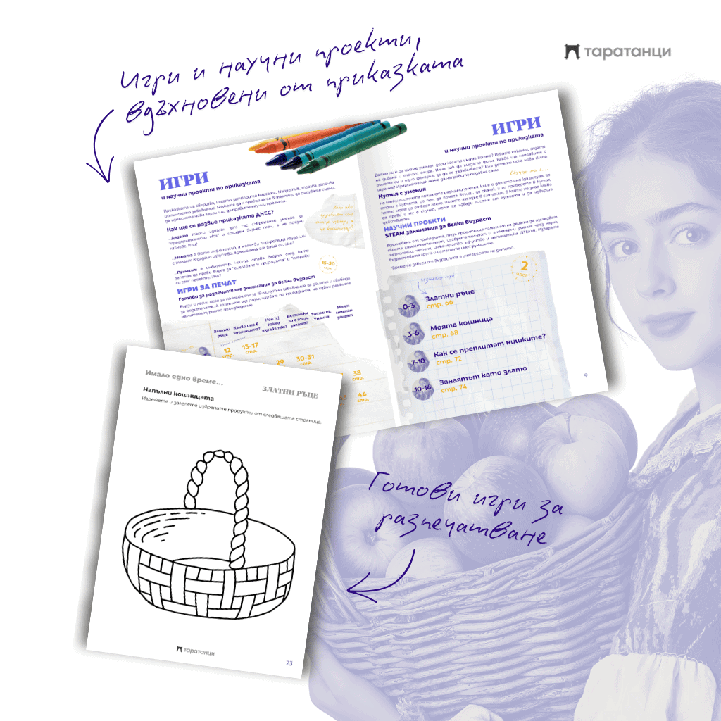 Активна онлайн книжка, вдъхновена от народна приказка „Златни ръце“, част от образователна поредица „Имало едно време…“ с готови игри за печат, творчески и научни проекти и всичко необходимо за театър у дома. Вътре ще намерите занимания за всяка възраст от 0 до 14 години. Задачите и указанията в книжката ще помогнат на децата (и родителите) да разберат, че да умееш нещо с ръцете си, да си способен да създаваш, е истинско богатство.