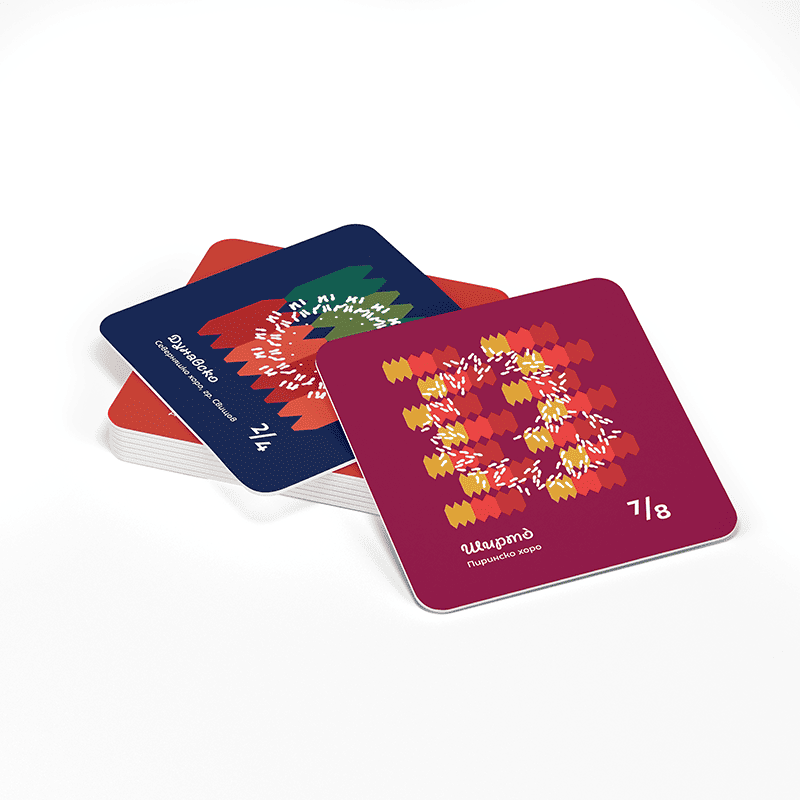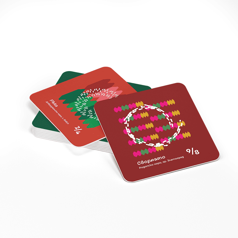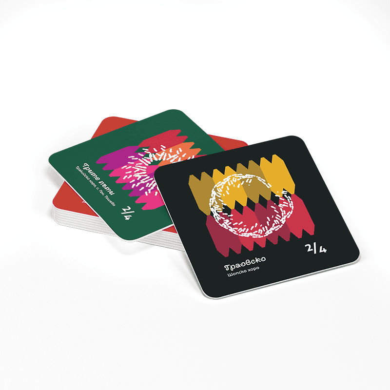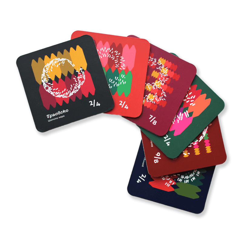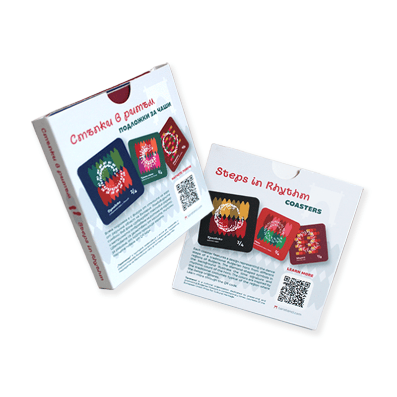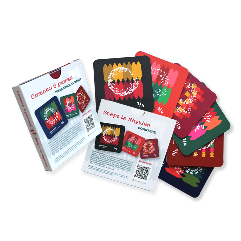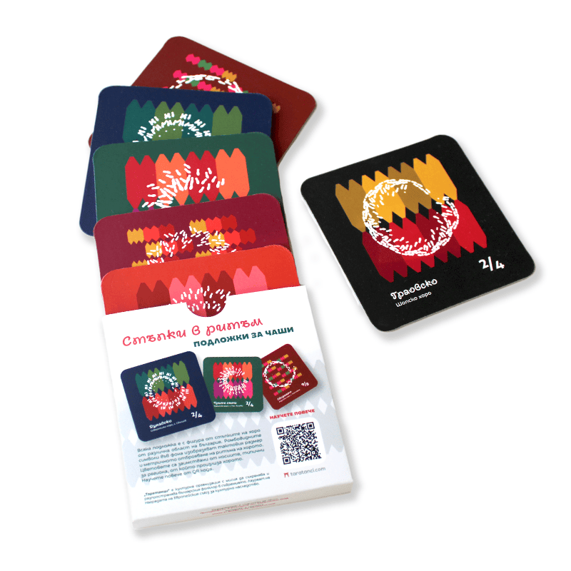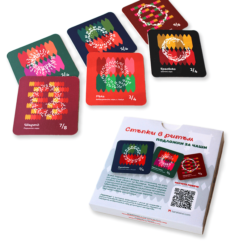Комплектът включва шест цветни подложки за чаши със стъпките на известни български народни хора́: