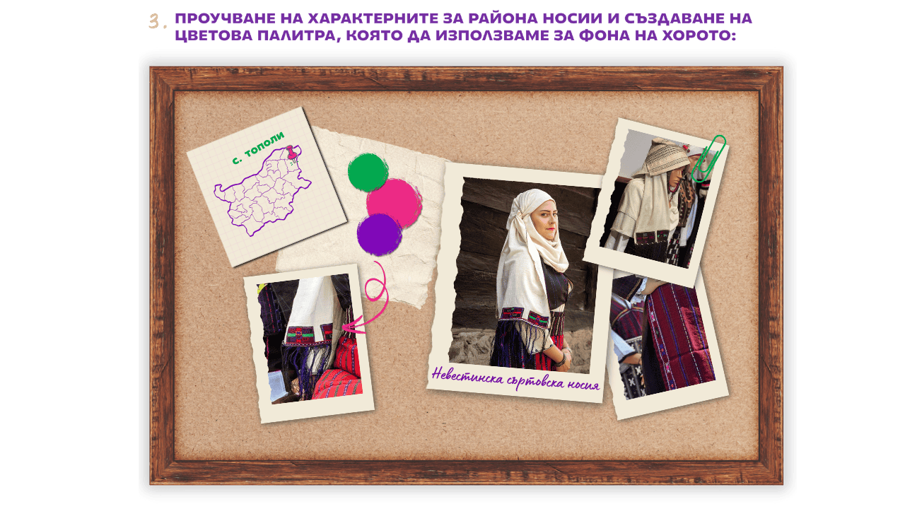 Срещаме съвременния човек с българските народни хора и танци по неочакван начин – чрез уникалните форми от стъпките на хорáта в комбинация с типичните етно цветове за всеки регион!